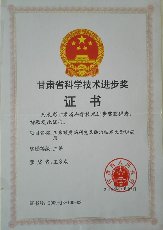 | 2010年榮獲甘肅省科學(xué)技術(shù)進(jìn)步三等獎(jiǎng)證書(shū) | ||