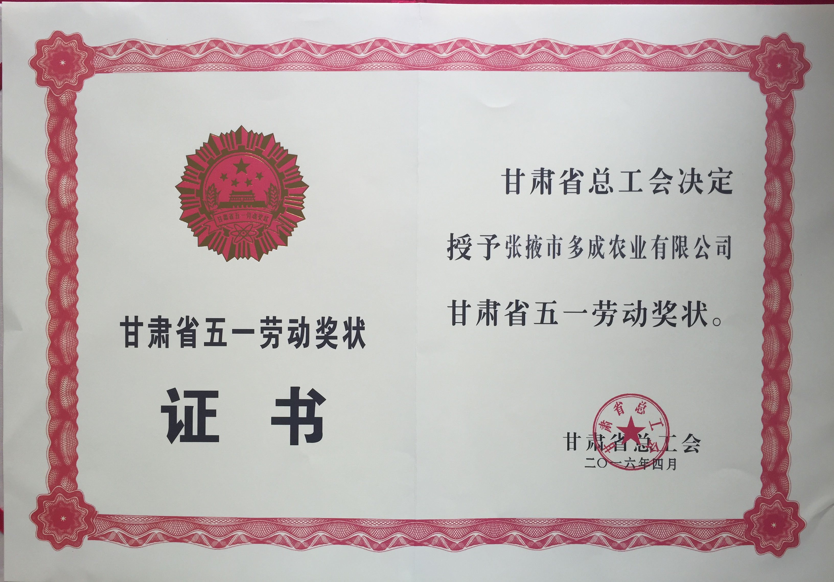 張掖市多成農業(yè)有限公司經(jīng)張掖市工會推薦,榮獲2016年度甘肅省五一勞動獎狀。