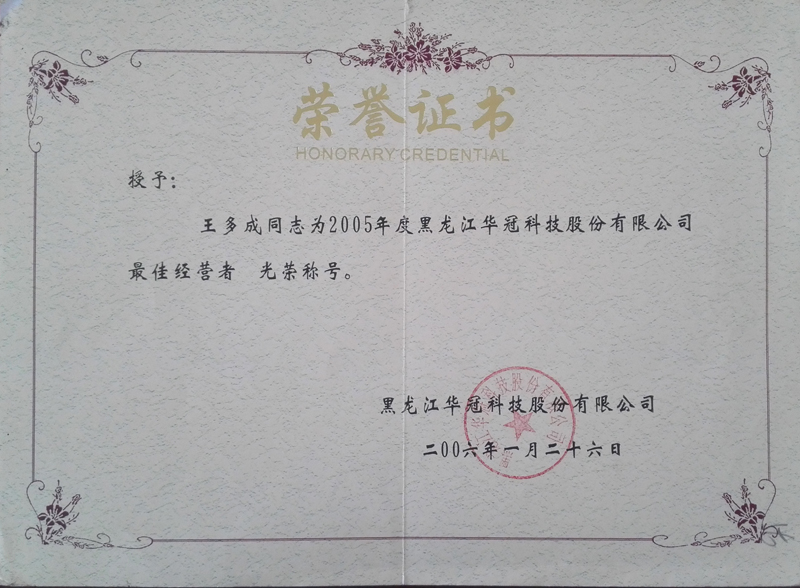 2005年度黑龍江花冠科技股份有限公司最佳經(jīng)營者