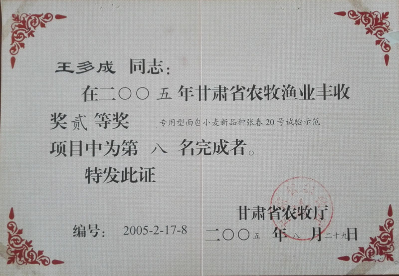 2005年甘肅省農牧漁業(yè)豐收獎二等獎